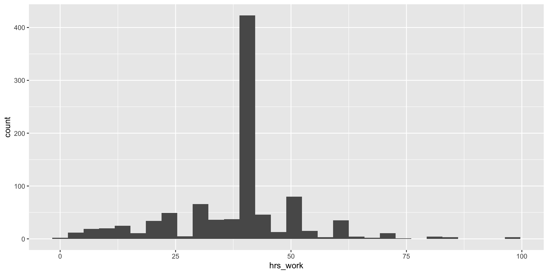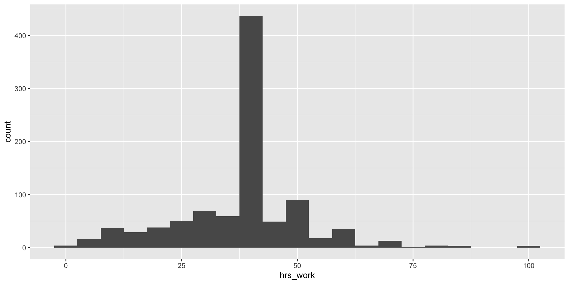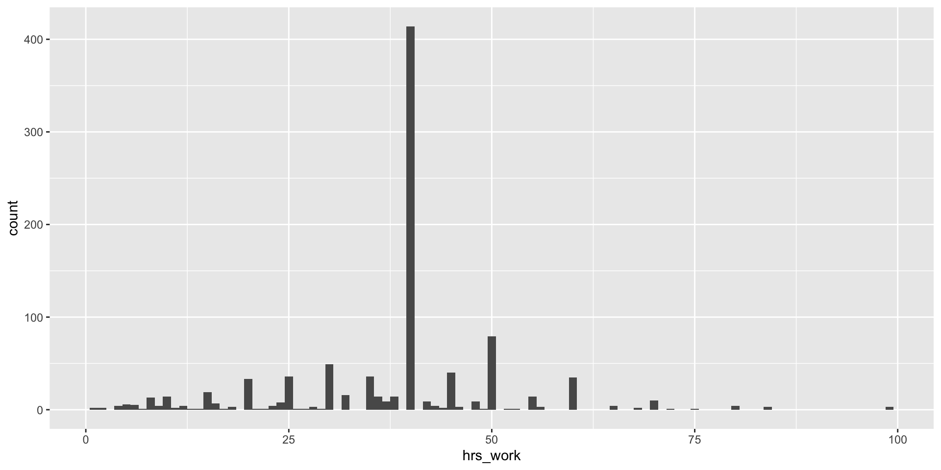 binwidth sets the width of each bar: eg, each bar should represent 5 hours worked, or 10bins instead to tell R how many bars there should be–10 bars, 20 bars, etcThe message is telling us that R took its best dumb guess, but we should pick something better.