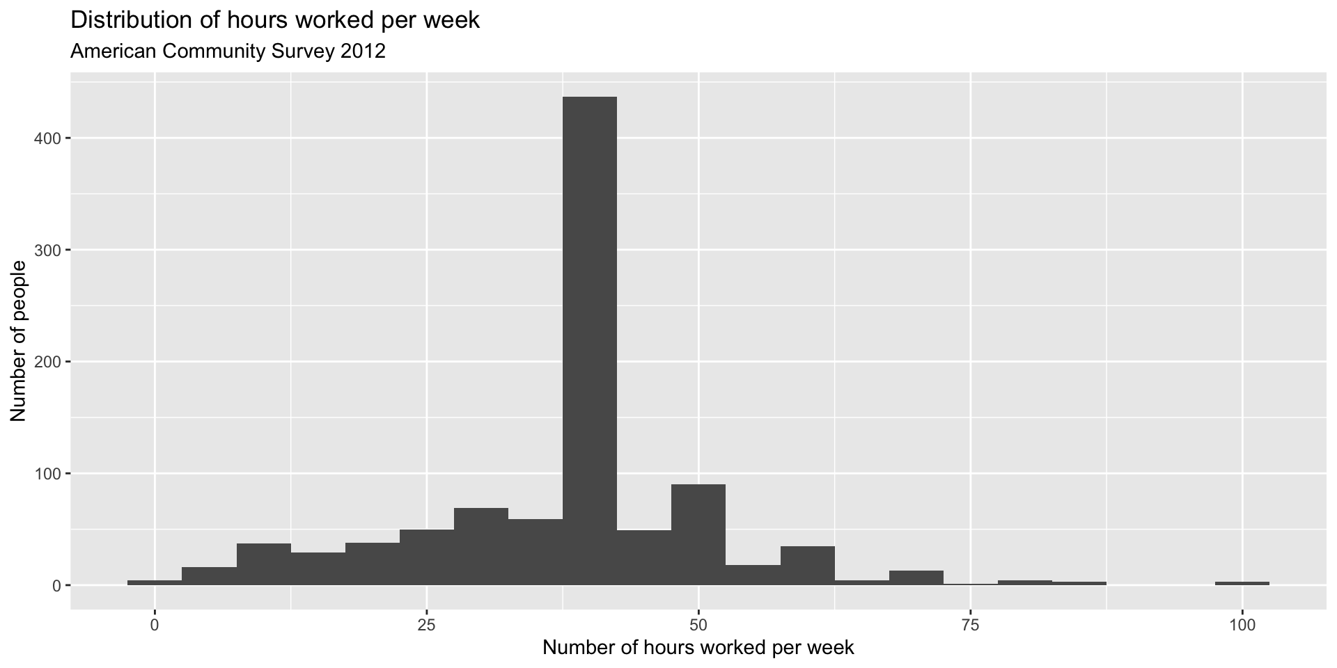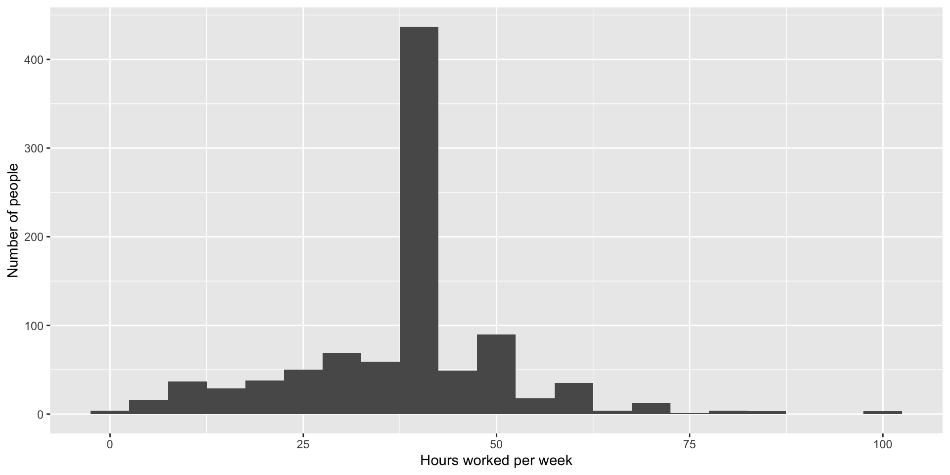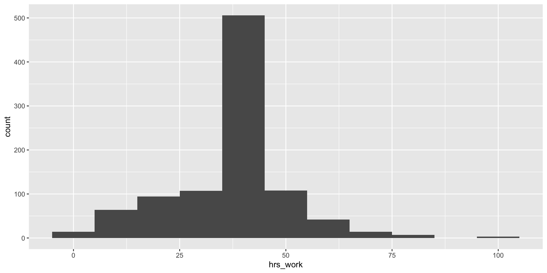 binwidth sets the width of each bar: eg, each bar should represent 5 hours worked, or 10bins instead to tell R how many bars there should be–10 bars, 20 bars, etcThe message is telling us that R took its best dumb guess, but we should pick something better.